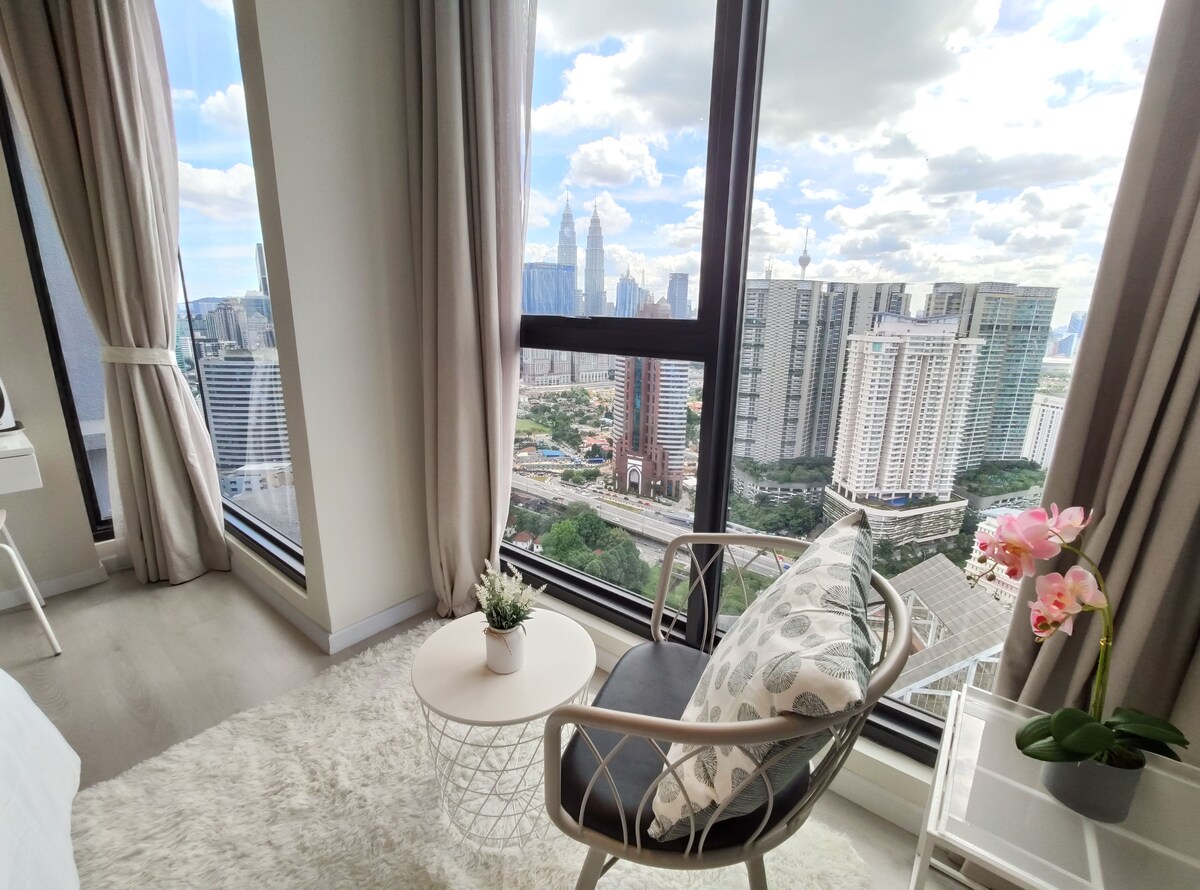 Elegantan 1BR Sky apartman s privatnim balkonom okrenut prema KLCC-u i KL tornju. Uživajte u večeri na nebu sa svog balkona dok gledate blistave svjetlosne predstave s oba legendarna tornja svake noći. Veliki bračni krevet, tuš kabina, kompletna kuhinja, veš mašina s stalkom za sušenje, Netflix, brzi Wi-Fi. Opustite se u beskonačnom bazenu, jacuzziju na krovu i teretani. Prošetajte do Jalan Alora, Paviljona, Bukit Bintanga i novog trgovačkog centra TRX. Dolazak 0-24. Dostupni su prevoz s aerodroma i lokalni obilasci. Vaš savršen smještaj u KL-u počinje ovdje!