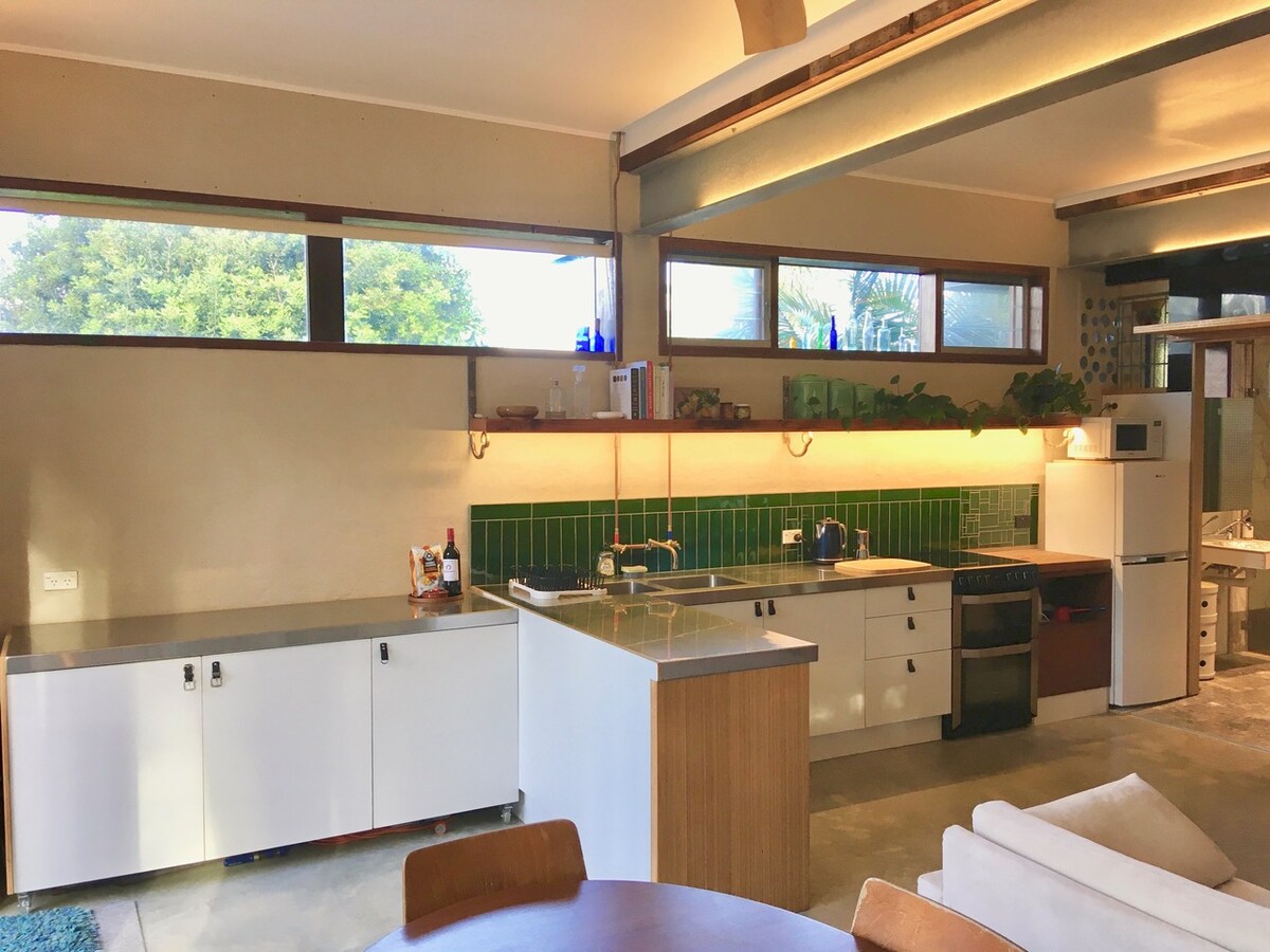 Nestled amongst the trees in the escarpment of the popular surf town of Thirroul, this stylish tiny house offers everything you need for a relaxing short or long stay. Start your mornings with a coffee on the private deck, unwind in the garden with a glass of wine at sunset, or take a short stroll to cafés, restaurants, shops and stunning beaches. Spend your days exploring the waves, coastal walks, vibrant food scene, then retreat up the hill to your peaceful, cozy escape on the Coal Coast.
