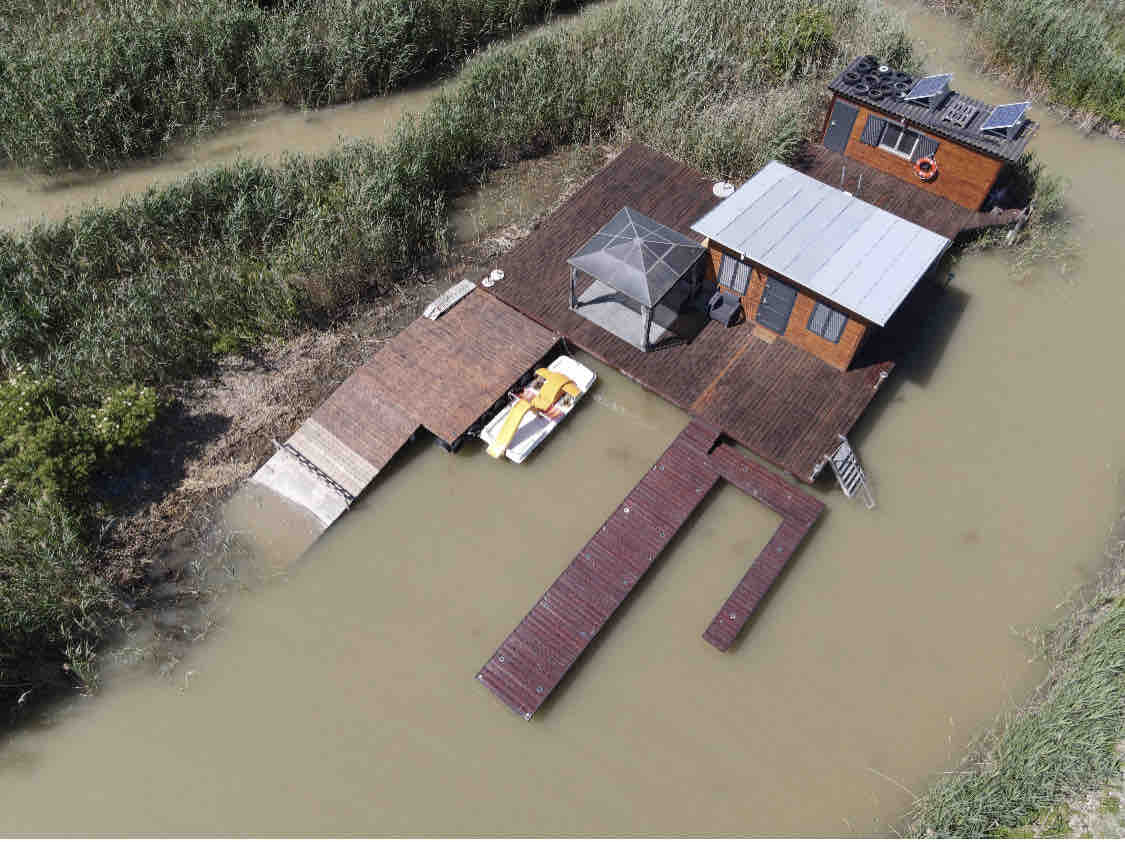Glamping = Lamborous Camping, novi trend: povratak prirodi i jednostavnosti, ali ipak udoban. Mir, osamljenost, slobodu, jezero, roštilj, ribolov, čitanje, izleti brodom, surfanje, jedrenje, biciklizam, vino, pubovi u divljini, Burgenland, stilizovana konstrukcija. Veliki, crveni električni brod ima dvije velike baterije i snažan motor od 800W. To je klasični Fronius brod, koji bi obično koštao čak 70 EUR po danu kada se iznajmljuje u luci. Brod je uključen u cijenu noćenja.
