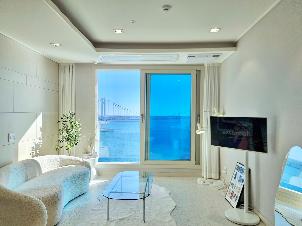 Dnevni boravak, soba s pogledom na most Gwangang • 3 sobe (2 spavaće sobe + dnevni boravak) • 3 kreveta • 66 m2 • besplatan parking • skladište prtljaga • 3 minute hoda do mora