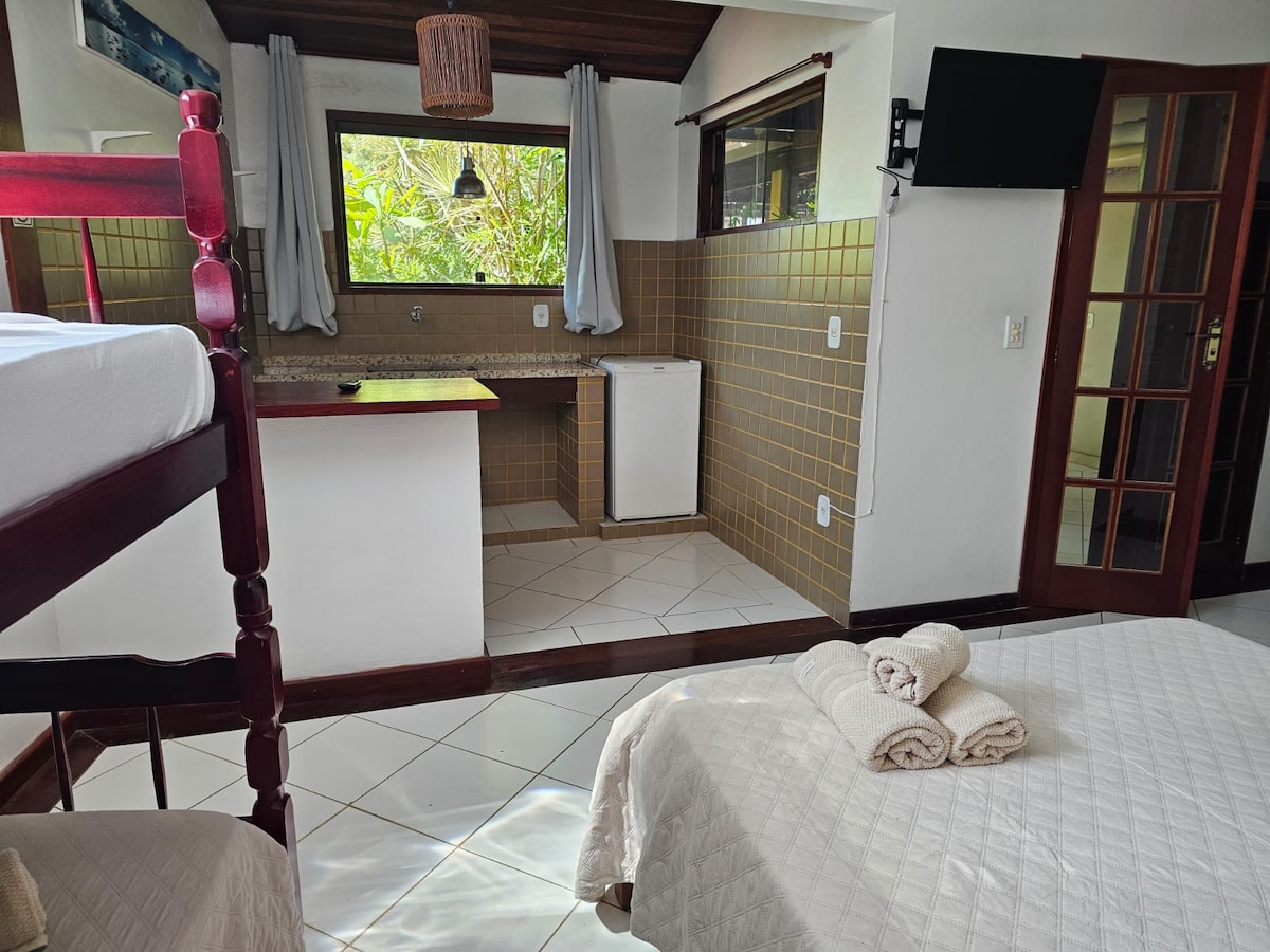 Ovaj elegantni smještaj je savršen za vašu porodicu da razmišlja o sjajnom, nenadmašnom pogledu s odličnom ventilacijom s gornjeg sprata. S uvoznim BRAČNIM krevetom s većom gustoćom i udobnošću i dvostrukim kaučem na razvlačenje uz 2 dodatna kreveta za jednu osobu. Ova ravna plaža nudi mnogo udobnosti i osjećaj da ste s „nogom u pijesku” na najboljoj lokaciji Praia do Forte.