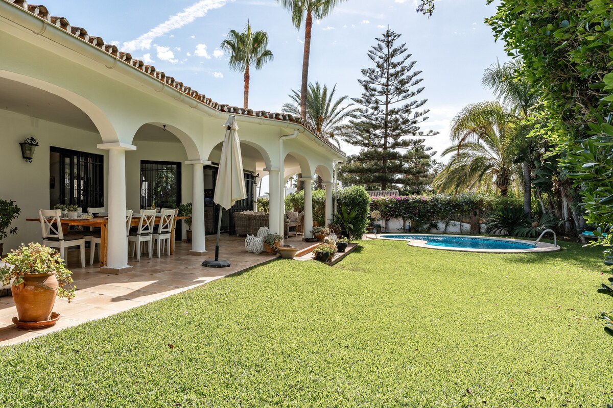 Ova moderna vila sa šest spavaćih soba može primiti dvanaest osoba i spaja privatni luksuz s fantastičnom lokacijom uz plažu. Možete se opustiti, uživati u pogledu na more, sunčati se pored privatnog bazena i uživati u objedovanju na otvorenom. Ova vila je prikladna za porodice ili grupe koje se žele okupiti i odmoriti. Smješteni između elegantnog grada Marbelle i andaluzijskog šarma Mijas Coste, imat ćete pristup restoranima, barovima i klubovima na plaži koji su udaljeni samo nekoliko minuta hoda. Zaista divan smještaj!