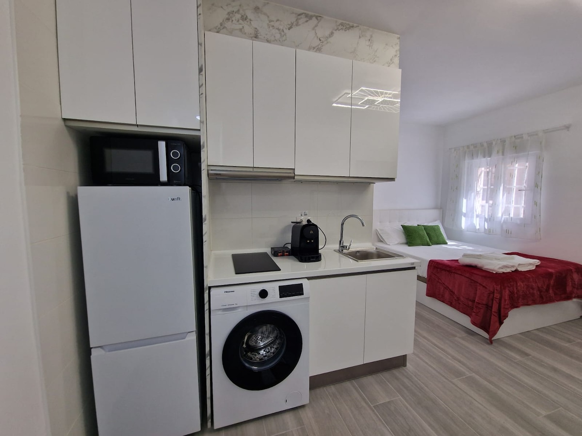 Udoban i avangardni novouređeni studio. Moderan dizajn u mirnom okruženju. Sve što vam je potrebno u okruženju, supermarketi, autobuska linija i obližnji metro. * Veliki krevet 150 x 190 * Visokokvalitetna pumpa za grijanje i hlađenje * Kupatilo s WC-om i pločom za tuširanje * WI-FI, televizija * Novouređeni, moderni zrak * Dostupna je opcija parkiranja (potrebno je zatražiti)