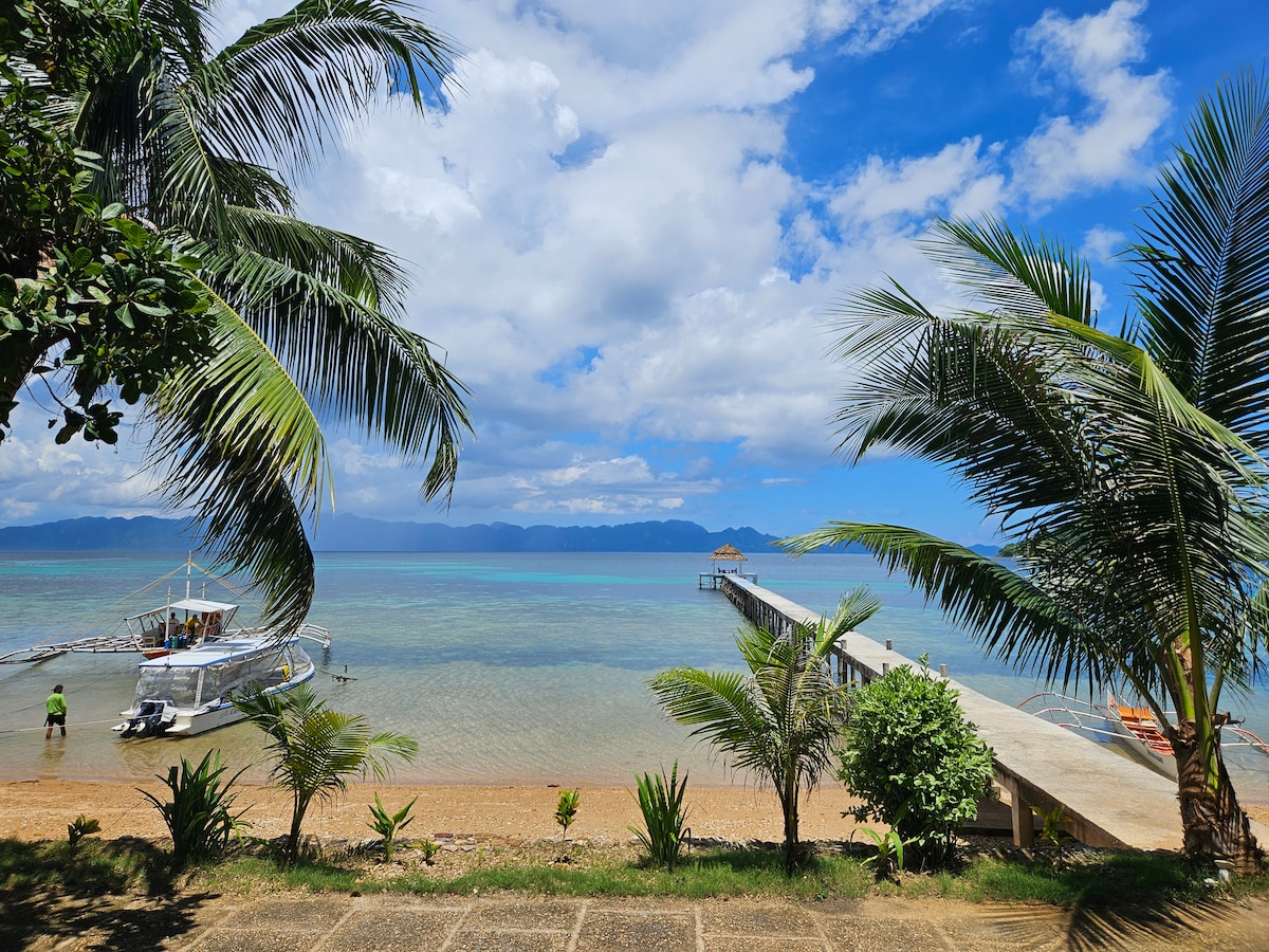 The beach is right outside your front door at Sand Island Resort. Snorkel the reefs or lounge on your spacious roof deck above to enjoy views of the islands and sunsets over the water. We offer island hopping, scuba diving, kayaks, and snorkeling gear. Fast Starlink satellite wifi, queen bed, ensuite, kitchenette, dining table, and ceiling fans. Extra foam mattress available to make a second bed. Meals available or cook your own. Only 30 minutes from Coron in our speedboats.