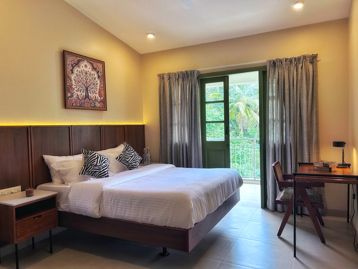 Our Signature Room is a design-forward space featuring a King bed, an open to sky bathroom, and a bathtub blending comfort with thoughtful aesthetics. The room is equipped with high-speed Wi-Fi, air conditioning, and a smart TV for a seamless stay. Located just 1.5 km from the beach and 900 meters from the local market, the property offers easy access while remaining a peaceful retreat. Our spaces are intentionally designed to foster community, creativity, and authentic travel experiences.
