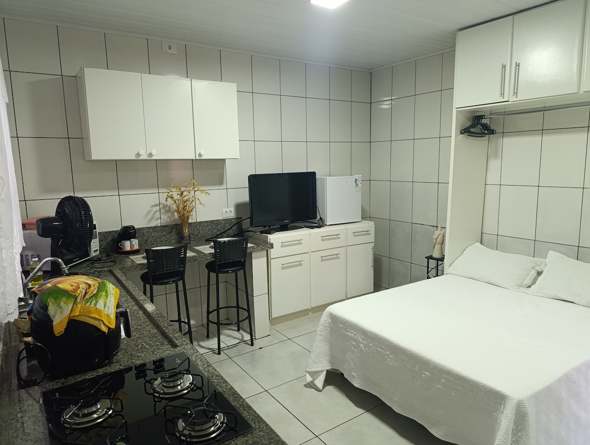 Relaxe neste lugar único e tranquilo. quarto reservado com banheiro privativo, fogão, microondas, Airfryer, frigobar, armários, louças, panelas e talheres. Cama casal. TV e wi-fi. Garragem aberta.