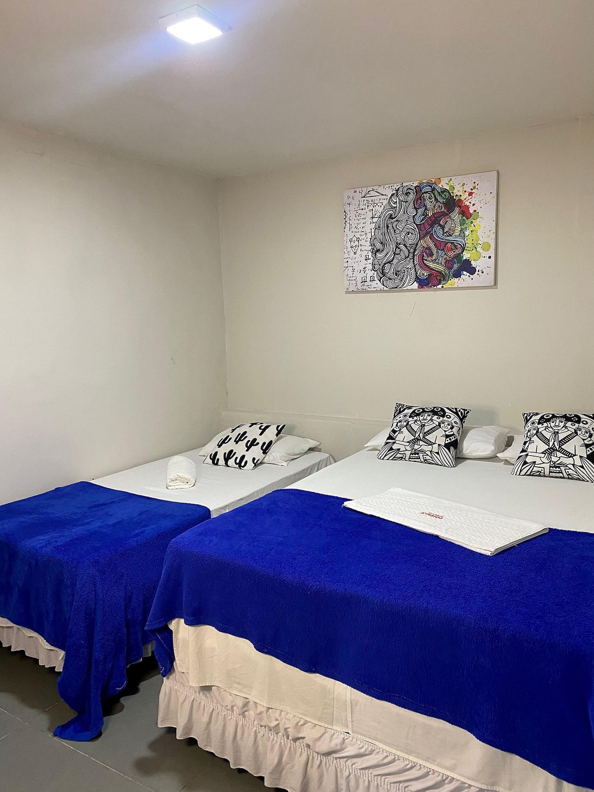 Quarto duplo aconchegante na Pousada dos Artistas, Rua Alfredo Alves Araújo 430, Santa Cruz. Ambiente climatizado, com WiFi e camas confortáveis. Arquitetura simples e charmosa que proporciona acolhimento. Localização estratégica, próxima a restaurantes, comércio e pontos turísticos, com fácil acesso ao centro e ao aeroporto, ideal para casais ou amigos em lazer ou negócios.
