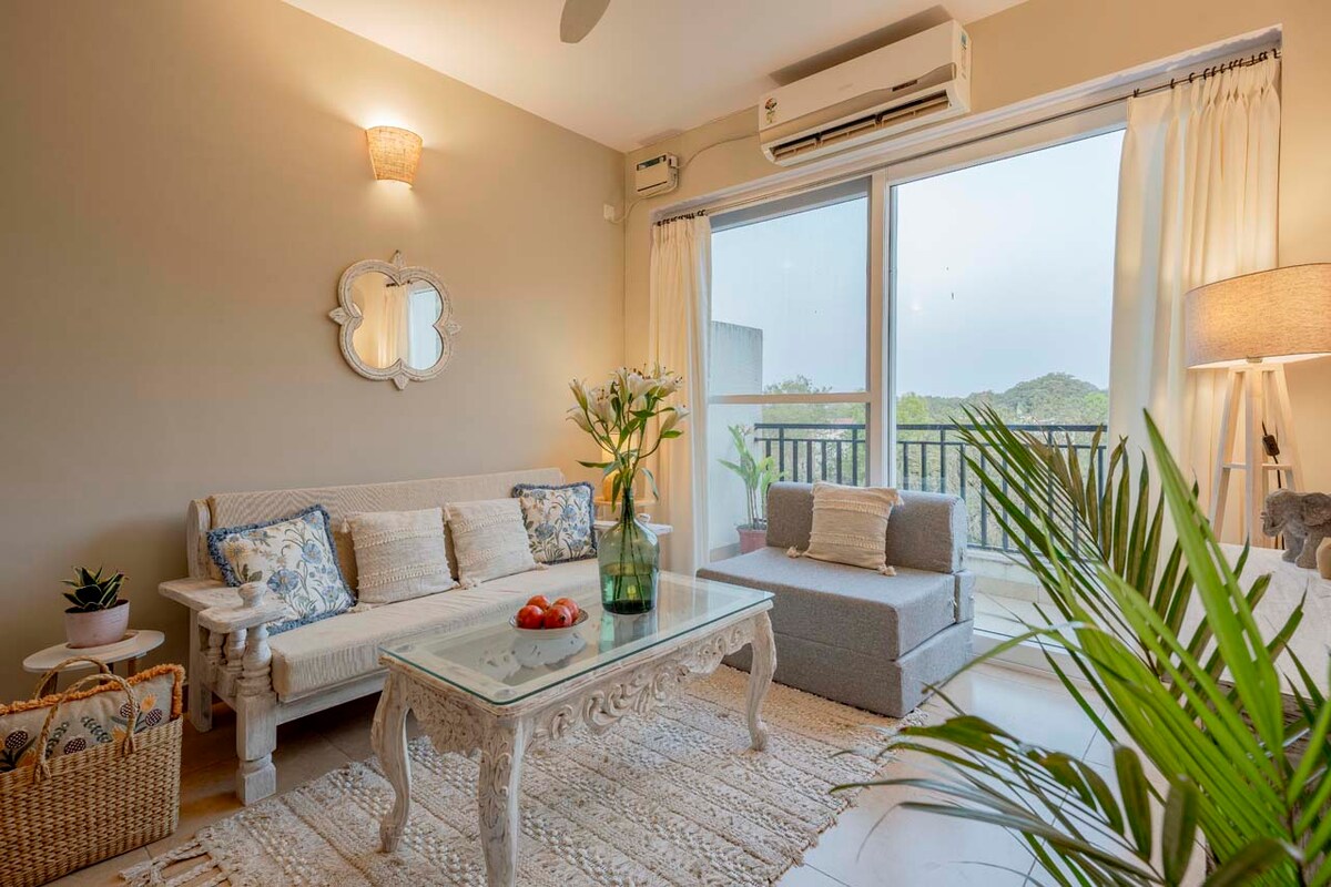 Eze by Earthen Window is a light-filled 1-bedroom duplex penthouse in Siolim, inspired by the calm, elevated charm of French hillside village by the same name. Thoughtfully styled with soft whites, warm wood, and curated details, the home features a cozy attic and a private garden terrace opening to uninterrupted green views. Set within a secure gated community with a pool, cafe, elevator, and high-speed Wi-Fi, it’s designed for quiet mornings, slow evenings, and effortless Goan living.