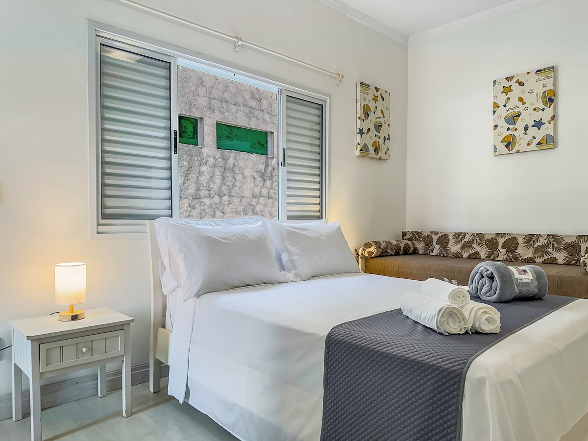 Flat Unique Santos mobiliado, apenas 230 metros da praia, menos de 3 minutos a pé. Roupa de cama, toalhas, ar condicionado, TV a cabo, wi-fi, cofre digital, secador de cabelo. Acomoda confortavelmente 4 pessoas, com uma cama de casal no quarto e um sofá cama na sala. Para maior conforto, o Flat conta com recepção 24 horas facilitando o check-in ou check-out, excelente café da manhã (pago a parte), piscina, academia, estacionamento com manobrista e limpeza diária, exceto domingos e feriados.