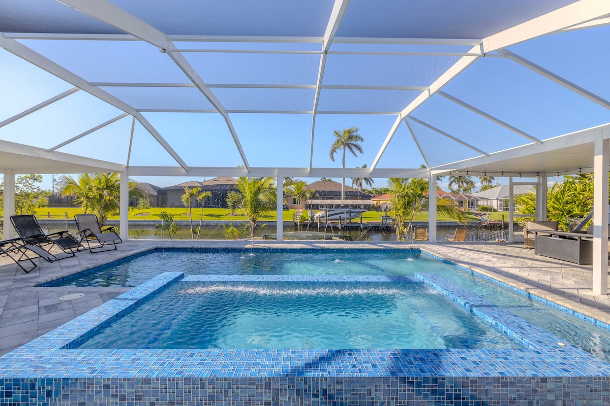 -All you need private retreat, 1 mile to downtown Cape Coral, 20 min to downtown Fort Myers & 25 min to Sanibel -Canalfront with heated pool & infinity-edge spa -Steam shower & spa-style toilets for a touch of pampering -Putting green & kayaks for outdoor family fun -Jet ski lift & 55’ boat dock—bring your water toys! -4 bikes for exploring the neighborhood -Garage gym -Tiki hut & outdoor lounge for family hangouts -Game room with pool table, shuffleboard, piano & karaoke—endless entertainment!