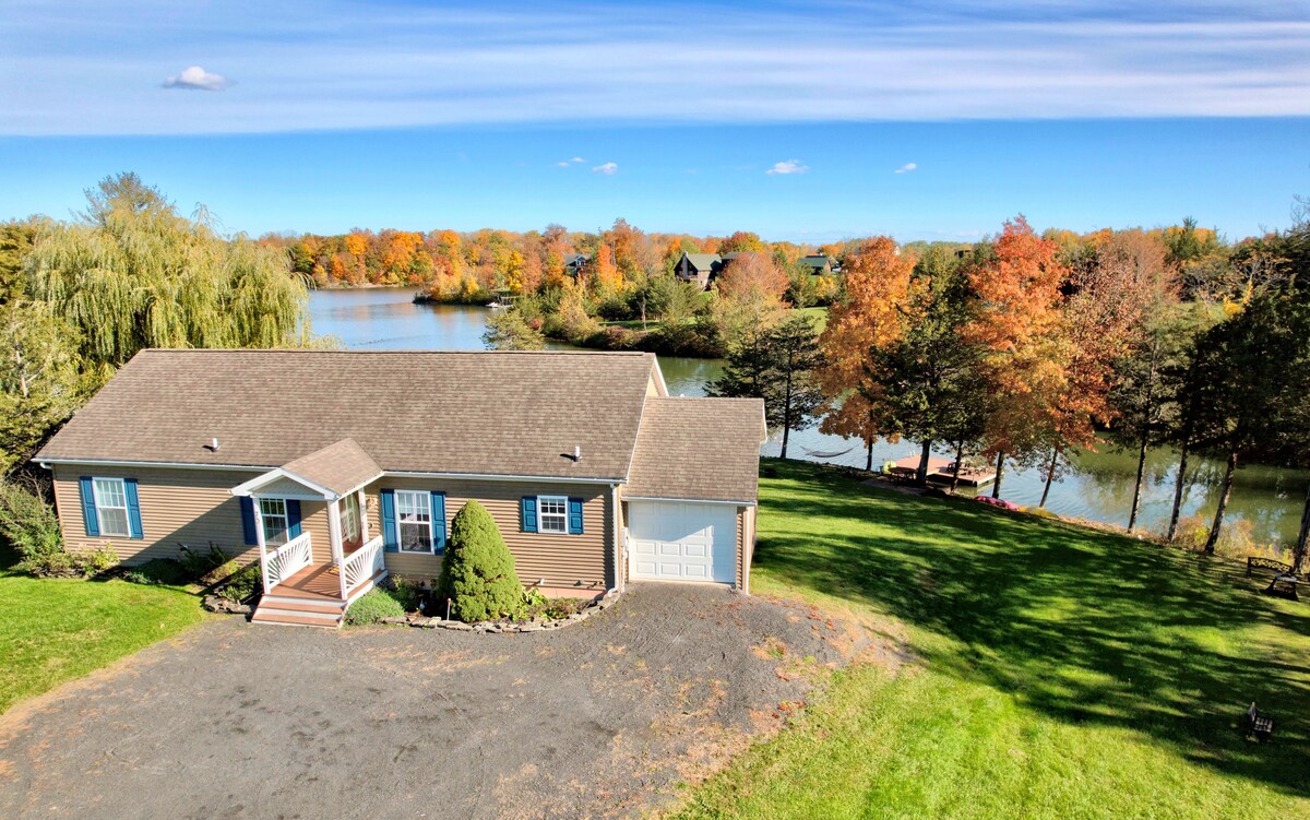 Uživajte u miru prirode dok boravite u ovom čistom, modernom smještaju s kosim krovom koji može spavati do 6 osoba. Prikladno za kućne ljubimce i preuređeno za savršen romantični odmor ili zabavu za cijelu porodicu! Nudi 120 stopa sigurnog pristupa jezeru i pogleda, jednu unutrašnju i dvije vanjske ognjišta i dovoljno stolica Adirondacks za sve. Ovaj A okvir nudi brzi Wi-Fi i streaming. 15 minuta od restorana, terena za golf, skijanja, vožnje motornim sanjkama, pješačkih i biciklističkih staza, muzičkih festivala ljeti.
