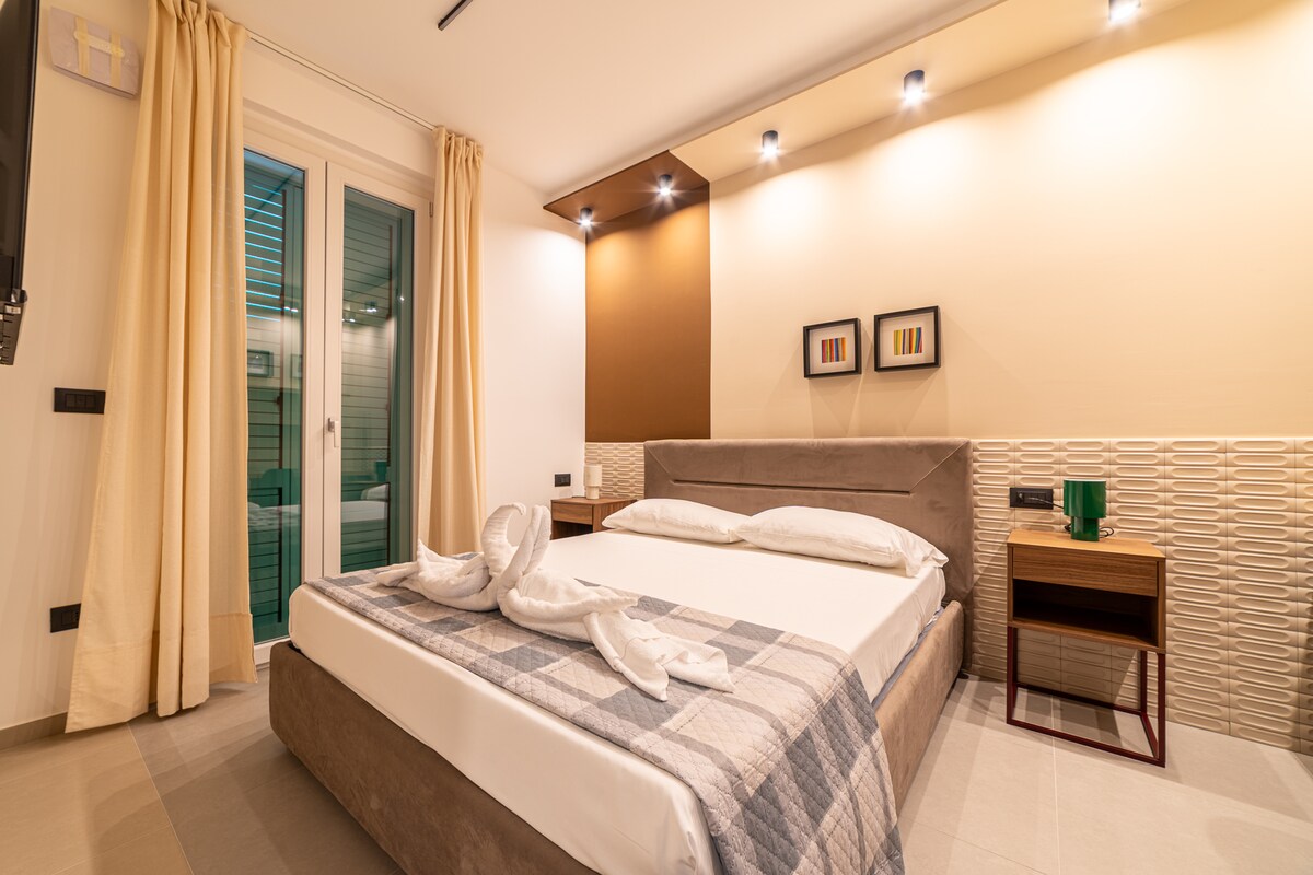 Luksuzni stan koji se nalazi samo 30 metara od plaže, preporučuje se za idealnu popunjenost za 2 odrasle osobe i 2 djece kako bi se osigurala maksimalna udobnost tokom njihovog boravka. Smještaj ima: - terasa s pogledom na more, opremljena dnevnim boravkom i trpezarijskim stolom; - dvokrevetna spavaća soba s privatnim kupatilom, dnevni boravak s kaučem na razvlačenje (u dnevnom boravku nema kapaka na prozorima); - 2 pametna televizora, WI-FI i klima uređaj u svakoj sobi, aparat za kafu; - 1 parking mjesto.
