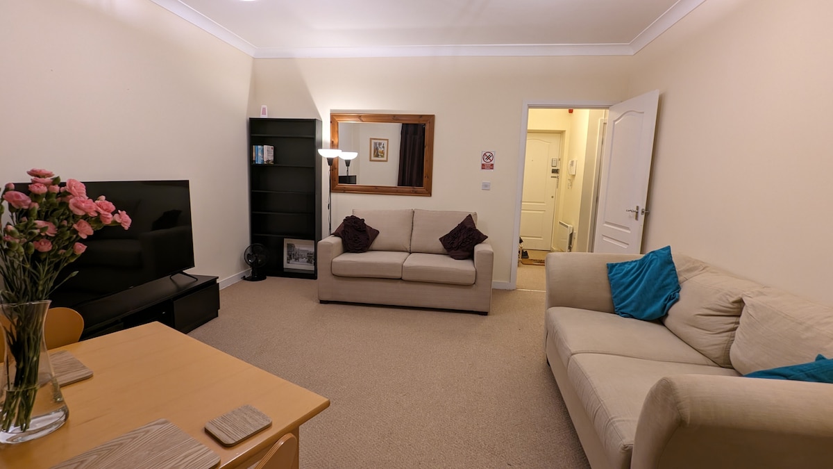 Ovaj moderni jednosobni stan (nije studio) može udobno primiti do 4 gosta jer se nalazi gornji dio kauča na razvlačenje s dvostrukim džepnim madracem. Ima sve što vam je potrebno i još mnogo toga za ugodan boravak: bračni krevet u Ujedinjenom Kraljevstvu, Wi-Fi (maksimalna brzina širokopojasnog interneta: 10 mbps). mašina za pranje/sušenje veša, mašina za pranje suđa, visoki frižider/zamrzivač, električna ploča za kuhanje, rerna, TV ravnog ekrana s Netflixom, DVD, pametni zvučnik, mikrovalna pećnica, čajnik, toster, sef, pegla, fen, toaletne potrepštine, peškiri itd.