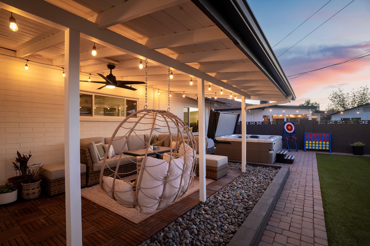 Nove slike učitane 24. augusta BESPLATAN GRIJANI BAZEN ZIMI I MASAŽNA KADA + NULA ČIŠĆENJA! NE PLAĆAJTE GRIJANJE BAZENA NA NEČIJEM AIRBNBU! Pročitajte moje recenzije! :) - NOVA prekrasna renovirana kuća s 3 spavaće sobe i dvorištem u stilu odmarališta, samo nekoliko minuta od Old Town Scottsdalea! Od BESPLATNOG grijanog bazena, jacuzzija, ognjišta, mini golfa i kabine u dvorištu, s najbržim Wi-Fi mrežom, KABLOVSKOM TV + i pametnim televizorima, nećete htjeti napustiti ovu oazu! Kuća je u potpunosti opremljena komplementarnim kafićem