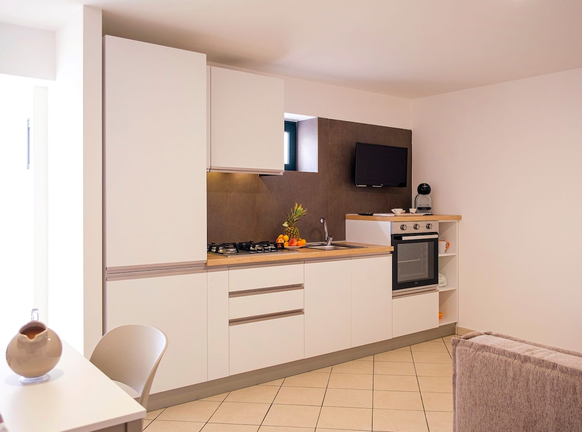 Newly built apartment, just 3 minutes on foot from the beach. The apartment has a bedroom with queen bed and a big living room with kitchen. In the living room there is s also a bed sofa. The apartment can host 4 persons. The kitchen is very comfortable and includes: microwave, oven, dishwasher and laundry washer. Car parking is inside and for free. There is also a barbecue area, a big garden and also a yard (with external table and chairs).