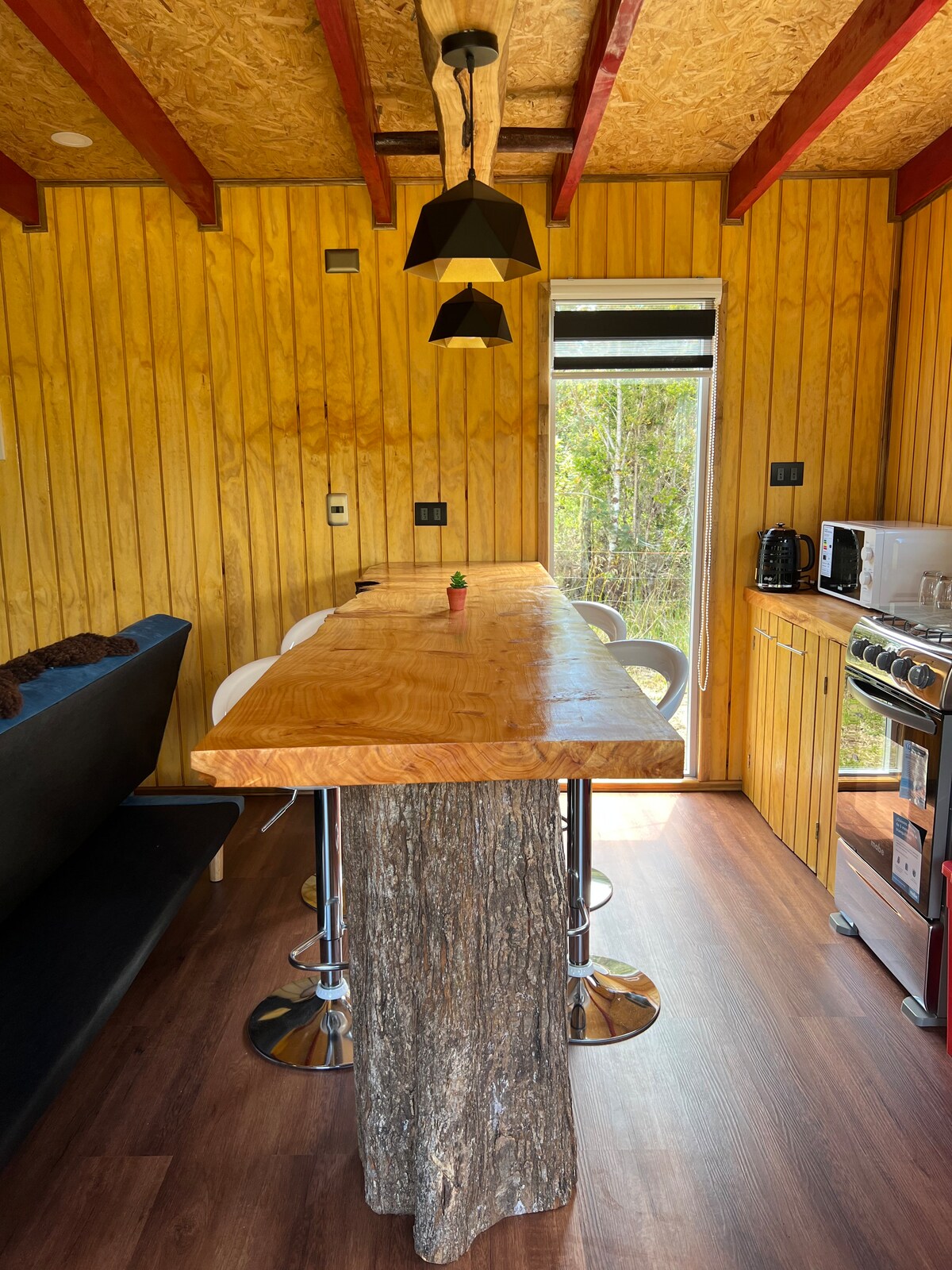 Odsjednite u minijaturnoj kući od 26 m² koju smo posebno dizajnirali i ručno izradili. Potpuno opremljen, ima zajednički prostor s ognjištem i roštiljem, te masažnu kadu napunjenu kišnicom koju prikupljamo s naših krovova, koja se rezerviše odvojeno kada dođete ovdje. La Pichi je savršen za dvije osobe s bračnim krevetom, a može primiti i treću osobu na taburu u dnevnom boravku. Glavni prostor je dnevni boravak s peći na drva i čajnom kuhinjom s kojeg se pruža panoramski pogled na lagunu.