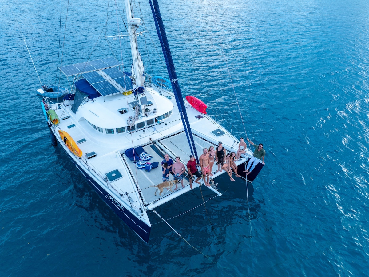 Ponovo se povežite s prirodom na ovim mirnim otocima u ovom inkluzivnom nezaboravnom smještaju. Opustite se dok vam mi uživamo u odličnoj hrani i pogledima koji oduzimaju dah. Isplanirajte personalizovano krstarenje oko vas. Ovaj katamaran je ekskluzivan za vašu zabavu s uključenim kapetanom i kuharom. Dođite se igrati na bijelim pješčanim plažama, roniti s prekrasnim koraljnim grebenom i otkrijte blistavu raznolikost morskog života tokom ovog životnog putovanja. Jedrite, ronite, plivajte, jedite, pijte i opustite se. Dođite se igrati!
