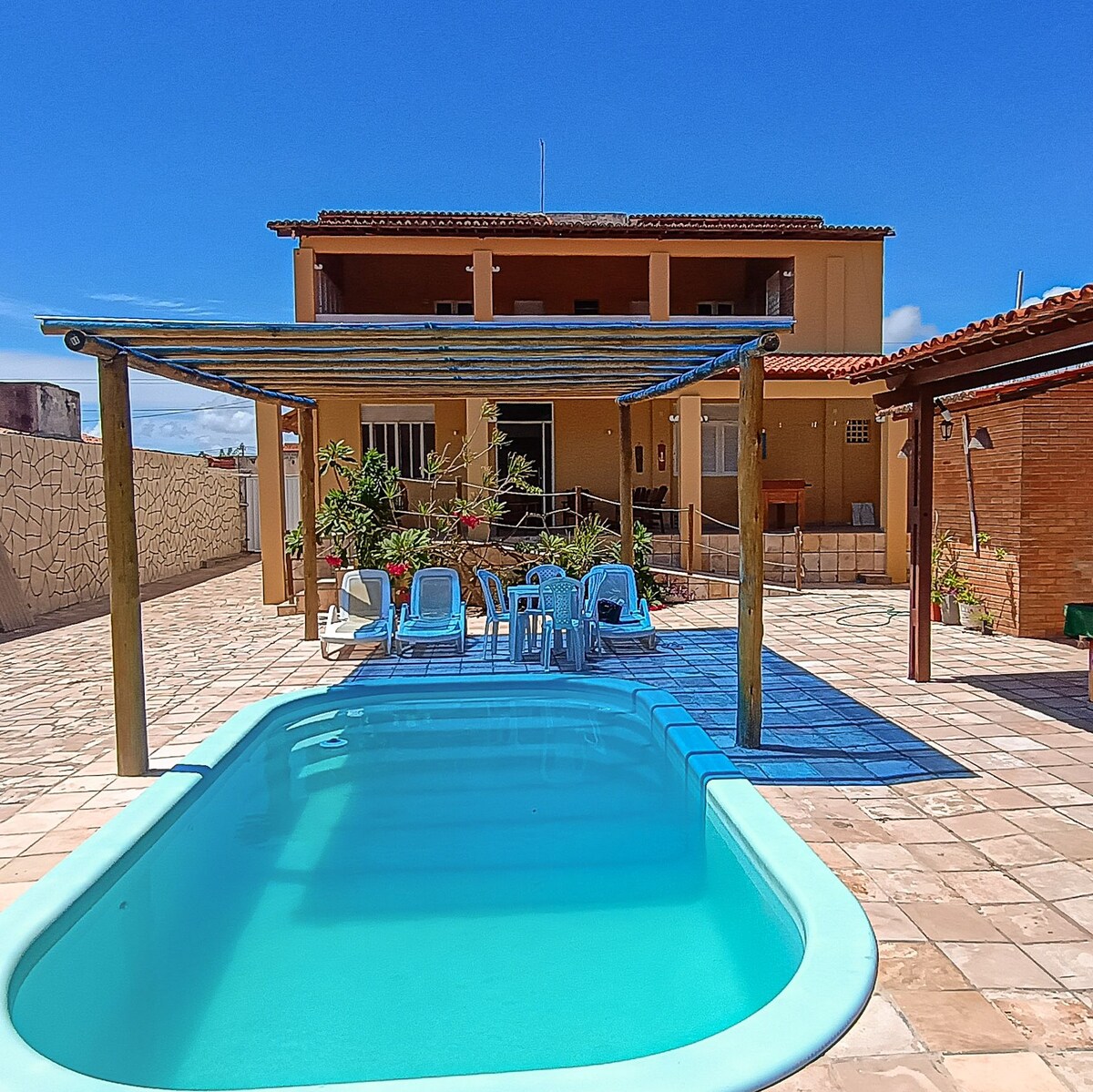 Rustikalna i šarmantna kuća na obali rijeke, smještena u Genipabuu, s panoramskim pogledom na more i ušće rijeke, u blizini plaža, dina i trajekata do sjeverne obale, 30 km od aerodroma i 15 km od Natala, u mirnoj ulici. Prostor: 2 spavaće sobe (1 apartman s bračnim krevetom; 1 spavaća soba s bračnim krevetom, krevetom za jednu osobu i klima-uređajem), 2 kupatila, kuhinja, dnevni boravak, 1 balkon, 1 dvorište s pijeskom na plaži, 2 vanjska tuša, vešeraj, Wi-Fi.