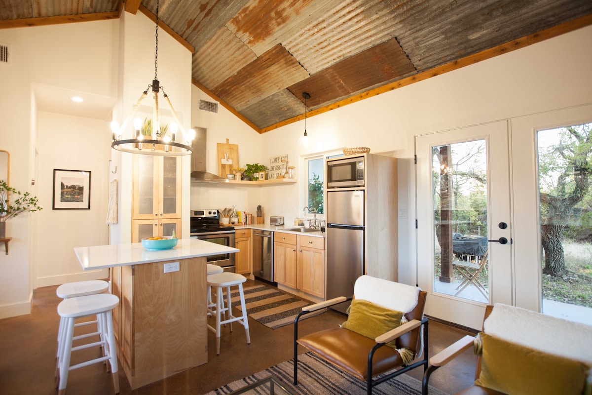 This artful rural retreat is a mix of quaint charm and modern elegance. Connect with a loved one or simply disconnect from the world. Watch the sunset or stargaze in complete privacy from the porch or hot tub that overlooks a meadow encircled with trees. Step inside to a flood of natural light. Cook a meal in the fully stocked kitchen. Get a great night's rest in the organic king-size bed. Explore nearby wineries, breweries, and hiking trails. Austin is a short drive from here too!