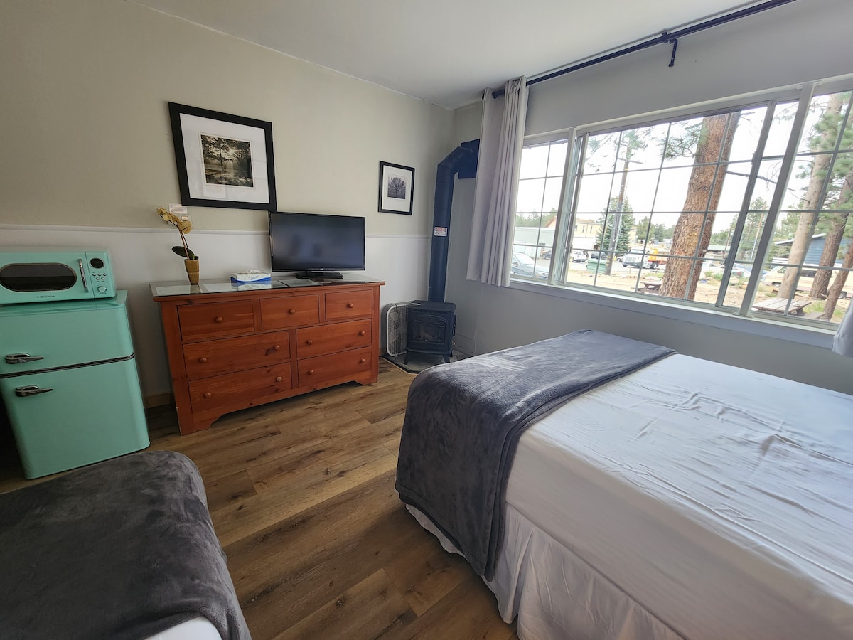 Eastside Guesthouse is a boutique hotel in the heart of Bishop, CA. Each room has a private outdoor entrance, this room has a queen bed, private bathroom with either a tub or shower (please message or call us if you wish to specify if you prefer one over the other, we cannot guarantee availability of your preference so please check with us). It also includes some shared spaces, including the kitchen, community room, and outdoor spaces.