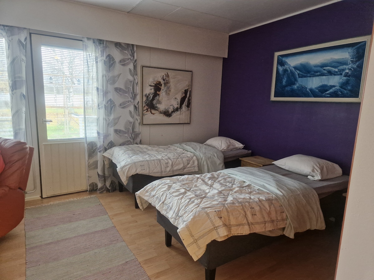 5 erillistä sänkyä makuuhuoneissa, lisäksi vuodesohva olohuoneessa. Erikseen sovittaessa majoittuminen jopa 8 hlölle. Majoituksen hintaan sisältyy: * liinavaatteet pedattuna * pyyhkeet * wc- ja talouspaperi * shampoo, hoitoaine ja saippua * mausteita, öljyä * kahvi ja tee * wifi * pysäköinti * loppusiivous Ilmainen pysäköinti monelle autolle talon pihalla, oven edessä. Talo sijaitsee sairaalan vieressä, kävelymatkan päässä keskustasta, rauhallisella alueella.