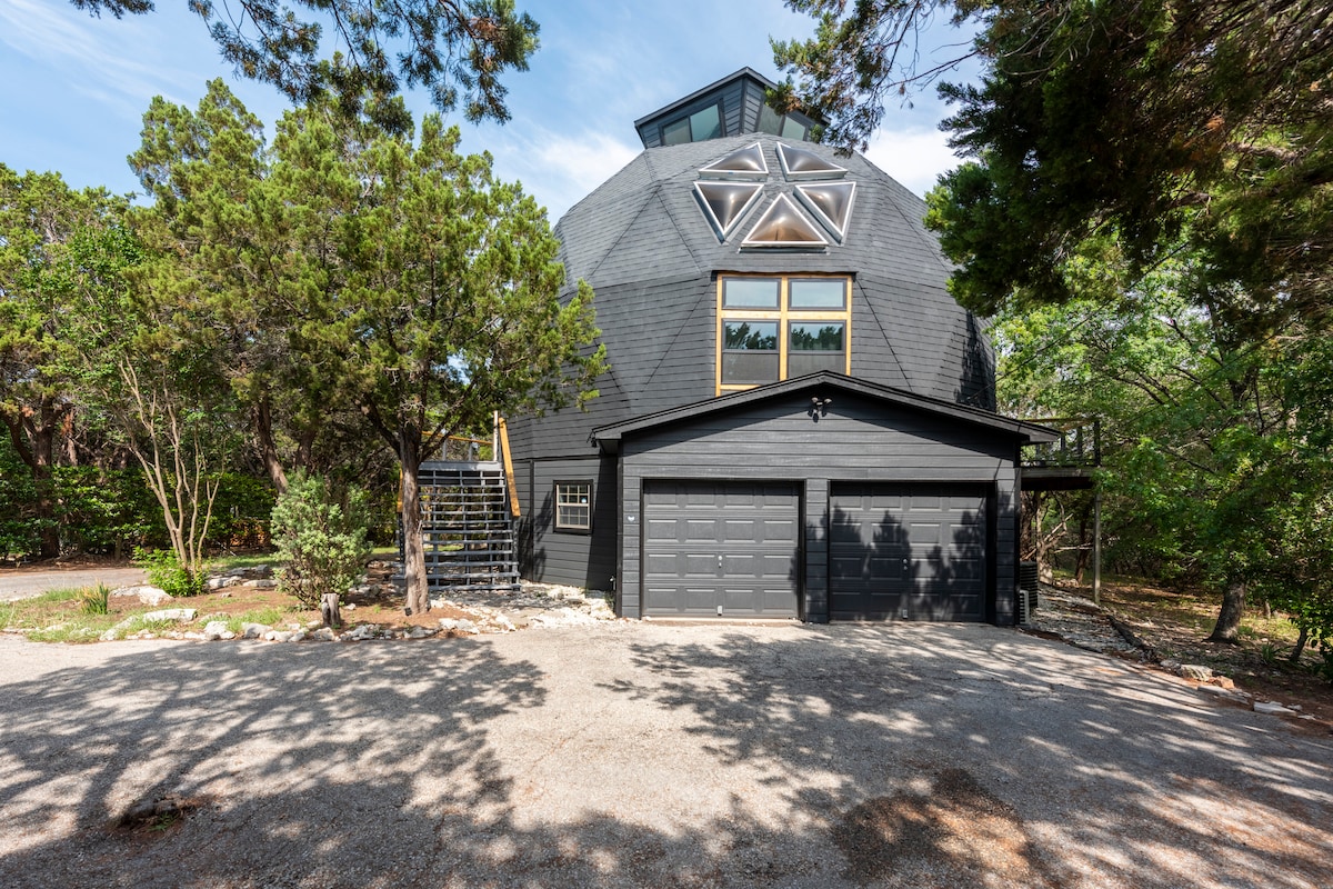 The Geodome isn't your ordinary vacation home. This stunning fully renovated tri-level dome is located on a quiet private road and offers beautiful treetop and lake views. Relax and enjoy being completely surrounded by nature w/o giving up any modern amenities. Just imagine waking up and enjoying a freshly brewed coffee while stepping out onto the treetop deck and smelling the crisp fresh air of Texas Hill Country. Leave the stress of the Big city behind and book now! Only 30 mins from Austin.