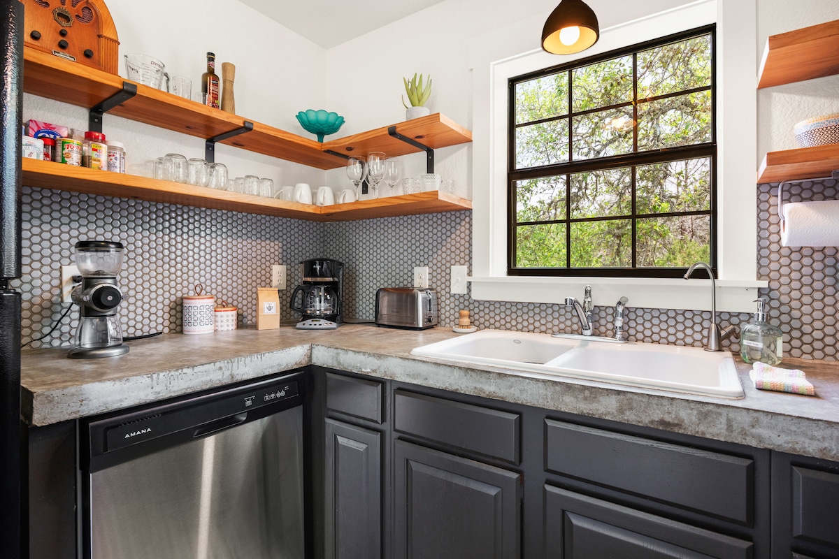 Pronađite mjesto mira i smirenosti ovdje u kući na drvetu senfa. Naša udobna kuća smještena je među drvećem i izgrađena na vrhu brda s pogledom na dolinu Wimberly. Donosi vam nevjerovatne izlaze sunca kako biste uživali uz kafu i zalaske sunca kako biste uživali uz dobru čašu vina ili vrući čaj. Udaljeni smo samo 5 minuta hoda od Blanco Rivera i River Roada i 3 minute vožnje do Wimberley Squarea. Kuća je dobro opskrbljena osnovnim kuhinjskim potrepštinama i proizvodima za kupanje kako biste se mogli opustiti.