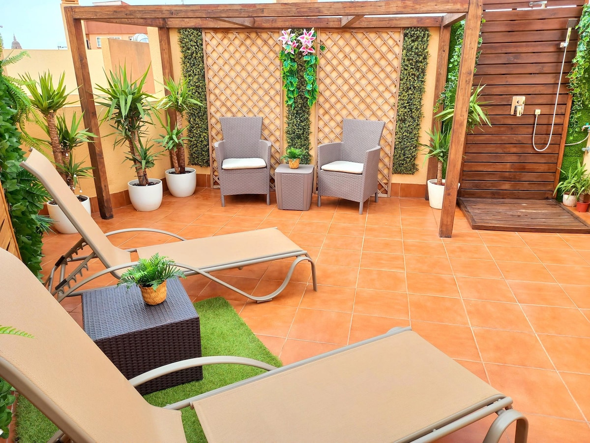 HISTORIJSKI CENTAR POTKROVLJA THYSSEN Šarmantni penthouse i velika privatna terasa, samo za goste, koja okružuje cijeli stan u centru Malage. Vrlo svijetla i udobna za posjetioce iz Malage. Udaljen je 2 minute hoda od muzeja Thyssen i La Calle Lariosa, čistog historijskog centra. Jedna spavaća soba s bračnim krevetom Kuhajte sa potrebnim potrebnim. Kupatilo s tuš kabinom. Besplatan radni prostor i Wi-Fi. Na zahtjev je dostupan krevetić i stolica za hranjenje.