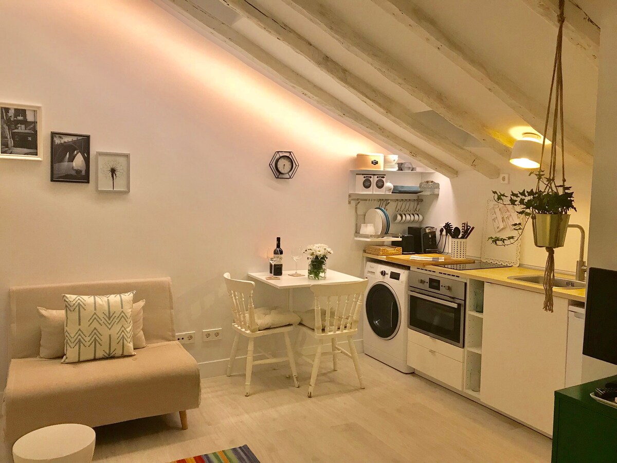 Mala, ali coqueta Buhardilla u području Palacio, Latina. Nalazi se na strateškoj tački i nekoliko minuta hoda od najtipičnijih mjesta i od najvećeg kulturnog interesa u Madridu. Plaza Mayor, Mercado de San Miguel, Puerta de Toledo, Sol, La Almudena, Kraljevska palača itd., sve ćete pronaći pješice i na samo nekoliko minuta udaljenosti. Nalazi se na četvrtom spratu bez lifta, udobne stepenice za penjanje po vašim torbama, pomažemo vam!!! Činimo vaš boravak što udobnijim i ugodnijim, uvijek smo u kontaktu s vama za sve što vam je potrebno. Smještaj ima sve što vam je potrebno za boravak, od posteljine i peškira do punog doručka i detalja dobrodošlice! Bračni krevet s odličnim madracem kako bi vam odmor bio što ugodniji!! Imamo i kauč na razvlačenje za dodatnu osobu. Naš stan je dizajniran da posjetite cijeli Madrid hodajući, a na kraju dana možete se odmoriti na mjestu sa svakim detaljima. Imamo posebne cijene za jednomjesečni boravak. Provjerite i mi ćemo prisustvovati i odgovoriti na vaša pitanja.