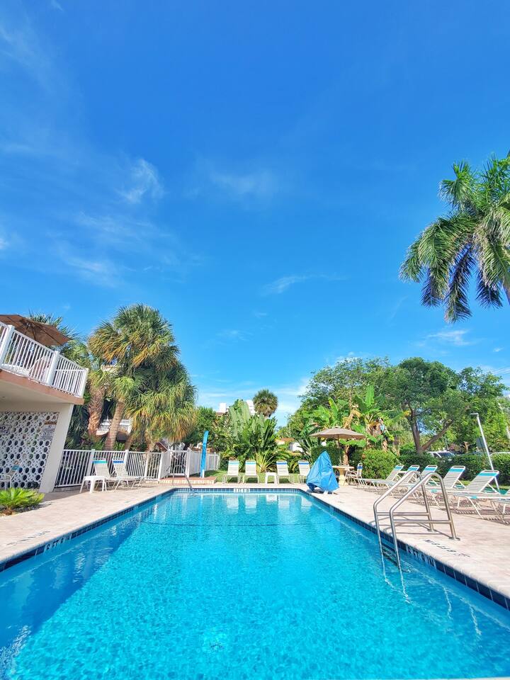 The Buccaneer-Ocean Drive(A1A) on the Island. Newly Renovirana - Predivno namještena čista jedinica udobno spava4 (bračni krevet ili 2 odvojena kreveta ibračni krevet za spavanje)Puna kuhinja,grijani bazen, praonica veša u sklopu objekta, besplatan parking bez potrebe za automobilom kao što su plaža,namirnice, trgovine,noćni život irestorani(12+), a sve to unutar 1 okeanskog bočnog bloka duž nagrađivane plaže „Blue Wave”. Ocijenjena je jedna od najčišćih plaža FLA! Stepenice do vidljivog okeanskog pejzaža, pristaništa za ribolov i kilometar popločane plaže popločane ciglom hodaju ispod slikovitih palmi.