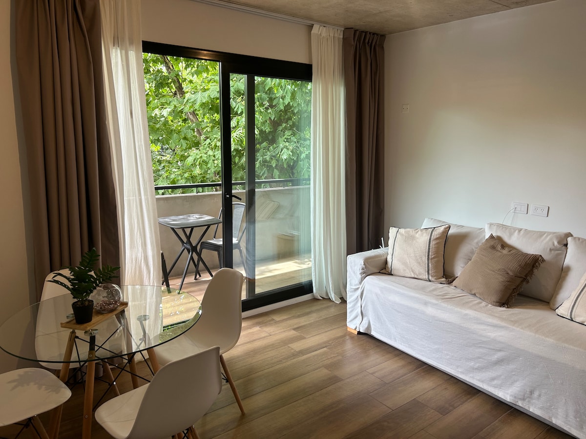 Acogedor monoambiente en Palermo, ubicado en 3er piso al frente con balcón, vista arbolada. Completamente equipado con todo lo que necesitas para una estadía cómoda. Cama Queen size, cocina totalmente equipada para dos personas, Tv con plataformas de series y películas activadas, WIFI, sábanas y toallones. Ubicado en una de las zonas mas cómodas y buscadas de la Ciudad, teniendo en sus alrededores gran variedad de restaurantes, locales comerciales, estadio Movistar Arena y transportes.