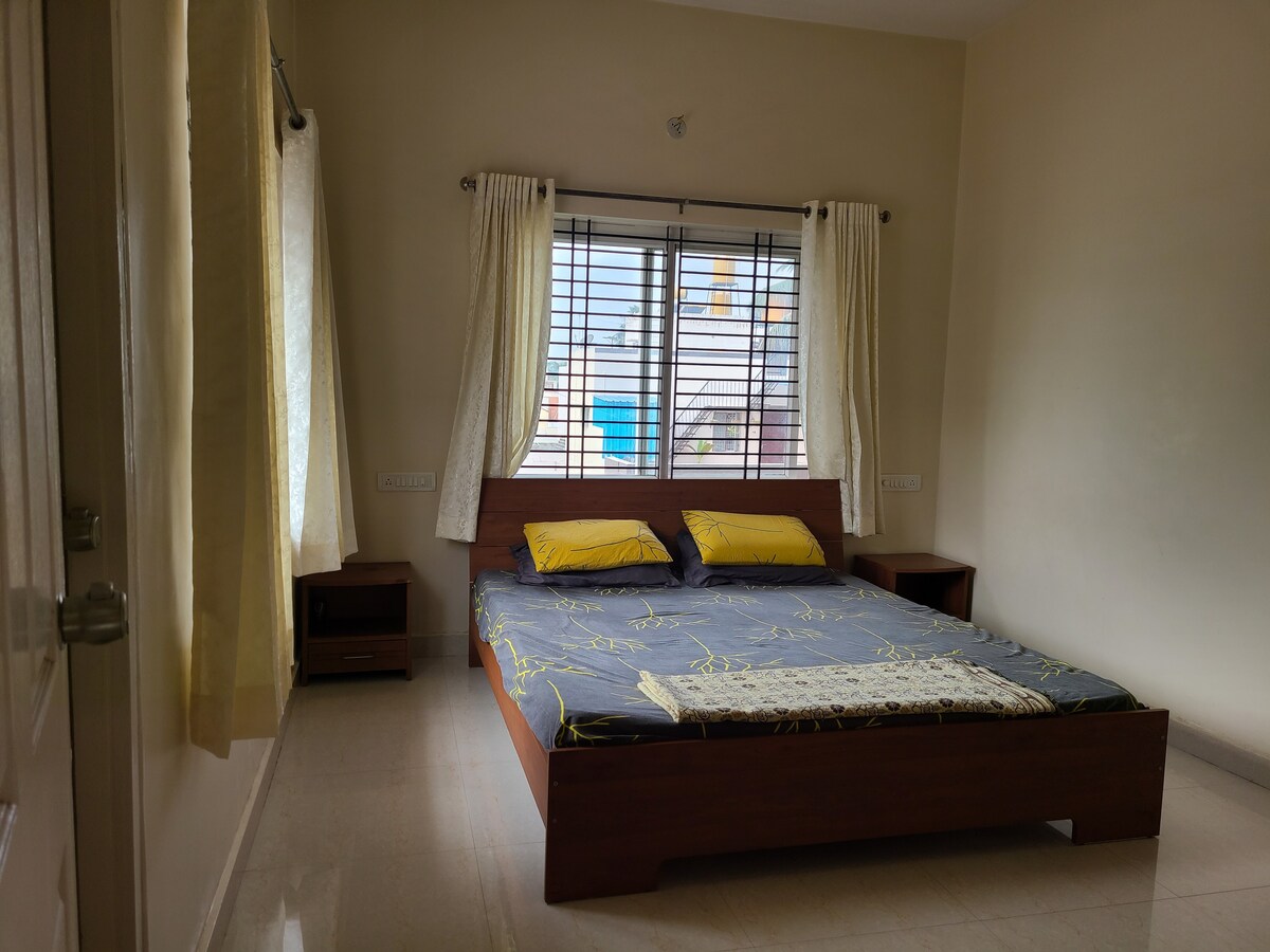 Cijelo nezavisno prizemlje nalazi se na jednom od najistaknutijih i najmirnijih lokacija Mysorea. Vrlo je blizu svih turističkih destinacija. S više od 100 restorana u blizini, dobit ćete najbolju kuhinju u nekoliko minuta. Objekat ima sve sadržaje kao što su 24 zalihe tople vode, potpuno opremljena kuhinja, tri WC-a i jedno kupatilo. Jedna spavaća soba je opremljena bračnim krevetom, a druga je opremljena s dva odvojena velika kreveta. Dostupni su dodatni kreveti.