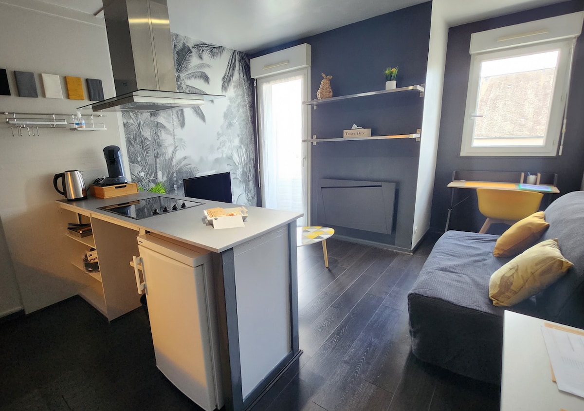 Šarmantne 2 sobe s zatvorenim dvorištem za automobil, prilagođen pristup PMR-u, vrt. 10 minuta od centra Tours, 200m od CH Trousseau (bez sirene). Krevet je namješten po dolasku, 1 peškir po osobi. Prednosti stana: - svijetla i prostrana soba od 12 m2 - udoban dnevni boravak od 17m² s opremljenom kuhinjom, mašinom za suđe, kombinovanom rernom, TV-om, radnim prostorom i 1 novim kaučem na razvlačenje - Kupatilo od 7m² s tuš kabinom, umivaonikom, WC školjkom i mašinom za pranje veša