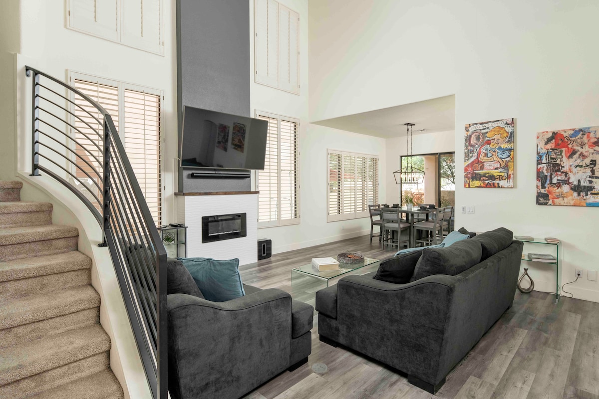 La Vieve Tempe Retreat je prostrano utočište s 4 spavaće sobe, grijanim bazenom, bilijar sobom i gotovo 232 m² elegantnog unutarnjeg i vanjskog prostora za boravak, samo nekoliko minuta od Državnog univerziteta Arizone i avenije Mill. Uživajte u modernoj kuhinji s kvarcnim ostrvom, otvorenom dnevnom sobom s kaminom i pametnim televizorom, ograđenom dvorištu s prostorom za sjedenje oko ognjišta i oazi u stražnjem dvorištu s travnatim travnjakom, natkrivenom terasom za objedovanje i dubokim bazenom savršenim za opuštajući odmor u Tempeu.