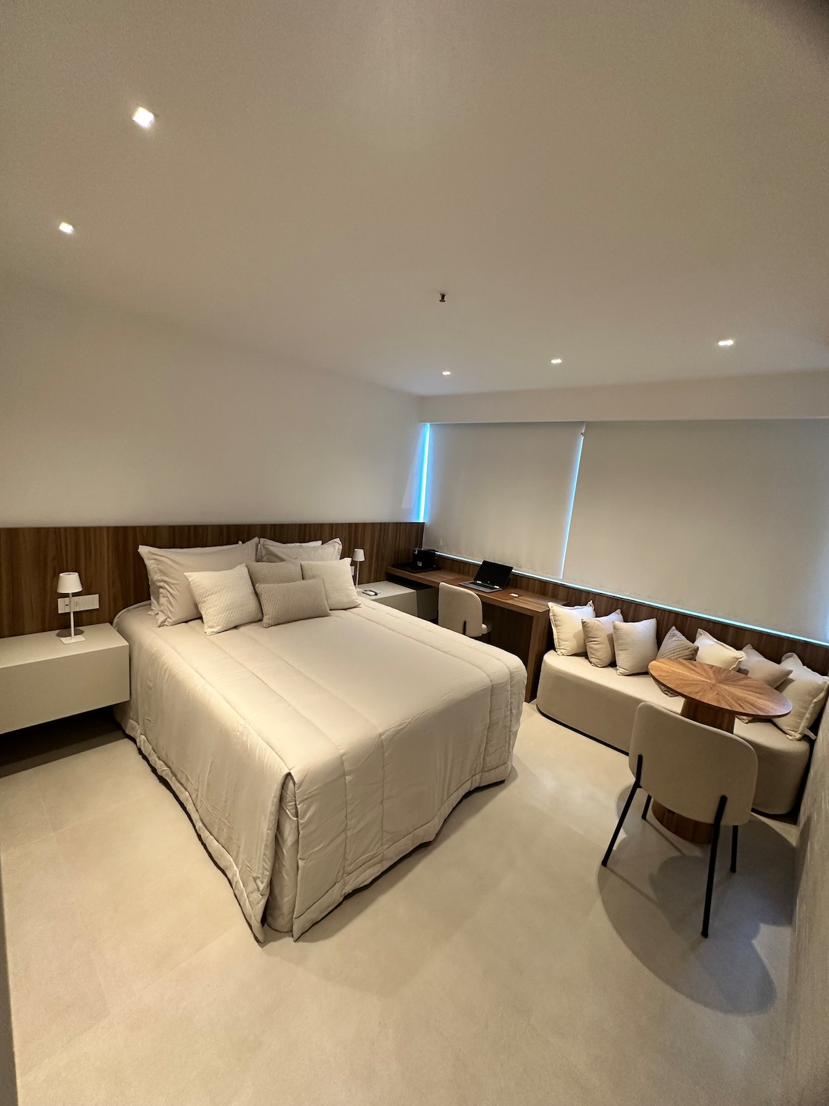 O apartamento é claro, arejado e cuidadosamente preparado para oferecer conforto. Dispõe de duas camas de solteiro que podem ser unidas, formando uma cama de casal, além de TV a cabo, ar-condicionado, armários e cozinha equipada com frigobar, micro-ondas, cafeteira, filtro de água, fogão de indução e sanduicheira. Ideal para quem viaja a lazer ou a trabalho. O condomínio oferece infraestrutura de excelência, com piscina, sauna, academia e restaurante.
