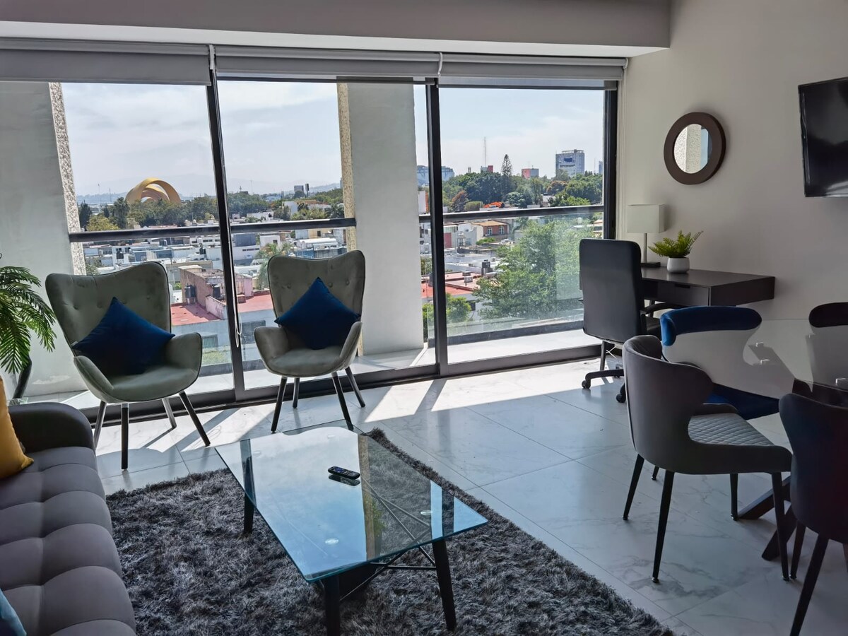 Nuevo y moderno edificio con la mejor ubicación, el departamento cuenta con una vista panorámica espectacular! La ubicación privilegiada estamos a 10 min de Plaza Andares a 10 min del centro de la ciudad a 5 min de Chapultepec a 10 min de la Expo y a 5 min de Providencia. Seguridad 24 hrs. El departamento está decorado y equipado por diseñadores para que vivas una experiencia confortable durante tu estancia. Aire acondicionado independiente disponible en cada habitación y en área común.