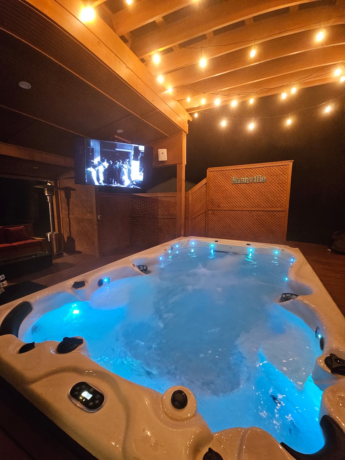 Peace and calm in a quiet valley less than 20-25 minutes from Nashville. Included in your stay is access to an enormous hot tub with a large TV for watching movies, 2 large patios and a BBQ grill. High ceilings and beautiful open spaces. Enjoy movies while relaxing in the hot tub under the pergola and stars. 1 King bed and 1 Queen bed on the 2nd floor, 2 Queen beds on the 1st floor. 2 Bathrooms upstairs, 1 Bathroom downstairs. Please note, parties are NOT ALLOWED quiet hours 10pm-8am