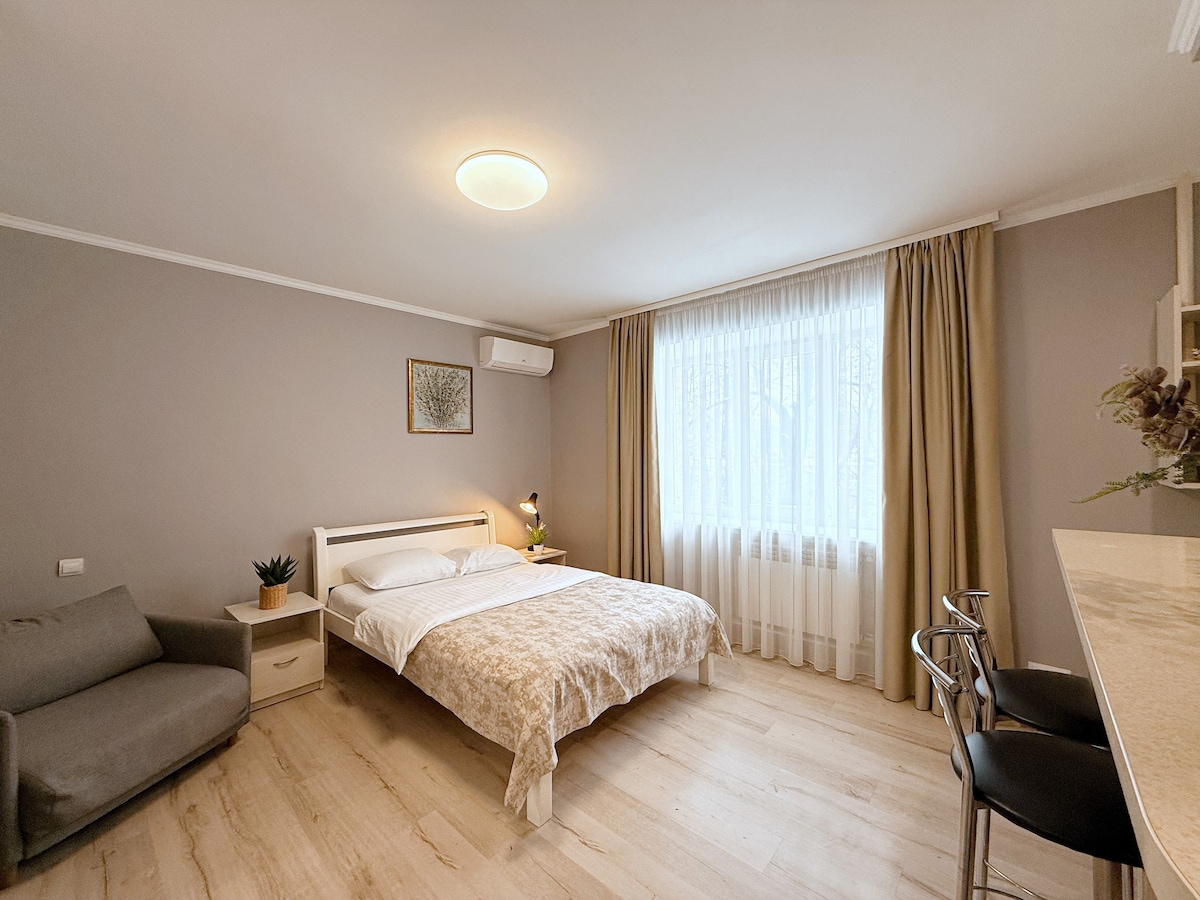 A cozy and modern studio in white and light gray tones on the 2nd floor. The building is located in the center of Kyiv near the shopping center "Gulliver", not far from the Olympic Stadium and Khreshchatyk Street, a 5-minute walk from the “Palace of Sports” metro station. The apartment has a queen-size bed and, if it is necessary, an additional fold-out bed. The studio has a small kitchen, bathroom and toilet with everything you need, smart TV and Internet.