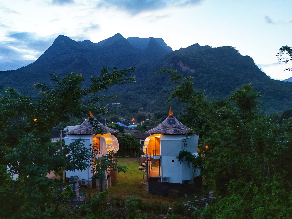 Wake up in a bright glass cabin surrounded by lush gardens and mountain air. Nestled at Dao Home Chiang Dao, this handcrafted stay blends comfort and calm — perfect for slow mornings, starlit nights, and creative breaks. Enjoy the bamboo lounge, bonfire space, and waterfall trails nearby. A cozy escape for dreamers, couples, and travelers seeking nature and stillness.