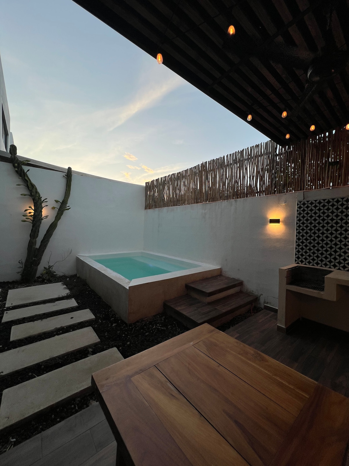 Private home with a great balance of colonial and modern. Perfect for one to two people who enjoy indoor/outdoor living. The house has amazing airflow with 16 foot ceilings throughout and an air conditioned bedroom. The patio and private dipping pool make the house a perfect refuge from the hustle and bustle of downtown. Only 1 block away from La Plancha Park, Merida’s new “Central Park” and 2 blocks from the start of Calle 47 Ruta de Gastronomia, the newly pedestrinized restaurant district.