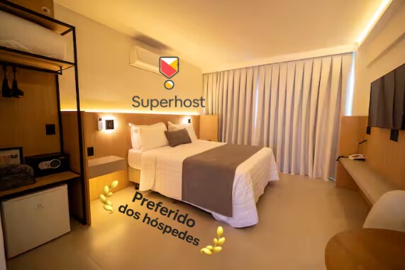 A suíte contém uma cama de casal Queen. Possui Wi-Fi, ar-condicionado, TV smart e cofre. O banheiro privativo inclui toalhas, shampoo, condicionador, sabonete e secador de cabelo. O complexo está localizado na Avenida das Cataratas e oferece facilidades para sua conveniência. No prédio, você encontrará lavanderia self-service, casa de câmbio, agência de turismo, locação de veículos, Subway e conveniência 24 horas com caixa eletrônico para operações bancárias a qualquer momento.