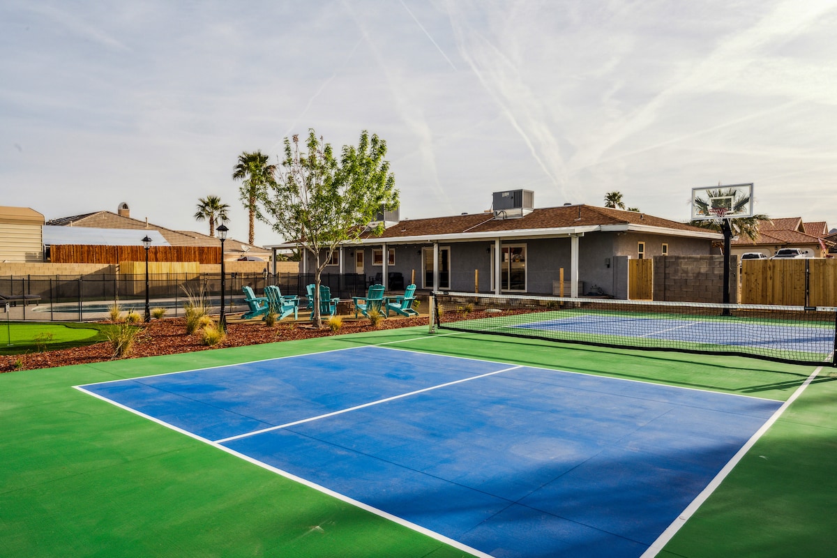 Ova prekrasna kuća učinit će da se osjećate kao kod kuće dok ste daleko od kuće. Ima dovoljno prostora za opuštanje i zabavu. Ponude: bilijarski sto, košarkaški teren, ognjište, teren za golf, pikado, kućni bioskop, stolni tenis, roštilj od 36'' Blackstone Griddle, Giant Jenga, Giant Connect 4, društvene igre, brzi Wi-Fi, kablovska TV, kafa/čaj i još mnogo toga. Svaka spavaća soba ima radni sto sa stolicom za goste koji rade. Bilo da istražujete Vegas ili samo uživate u ugodnom vikendu, sigurno ćete se fantastično provesti!