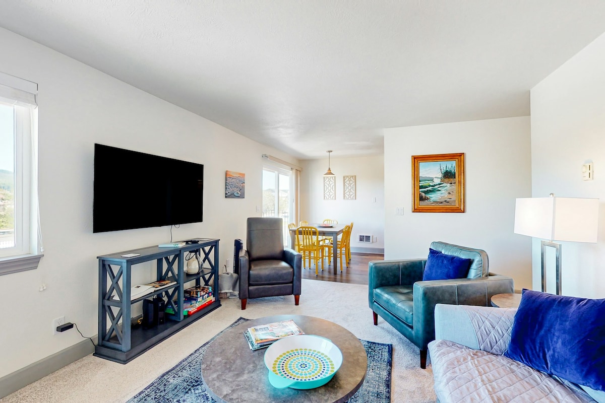 Jedinica Sandcastle B-4 - savršen odmor za parove i porodice. 1,5 bloka do plaže, ovaj renovirani, prvi sprat, 2 kreveta i 2 kupatila u južnoj plaži Cannon Beach je mirno mjesto za opuštanje 2 milje od centra grada. Uključuje garažu za 1 automobil opremljenu BESPLATNIM univerzalnim punjačem za električna vozila velike brzine i grijanim bazenom sa slanom vodom (zajednica). Nalazi se pored tržnice Fresh Foods Market i ima dovoljno sadržaja za djecu. Novi bračni madrac srednje čvrste veličine s plišanim nadmadracem i novim kožnim vrhunskim kaučem