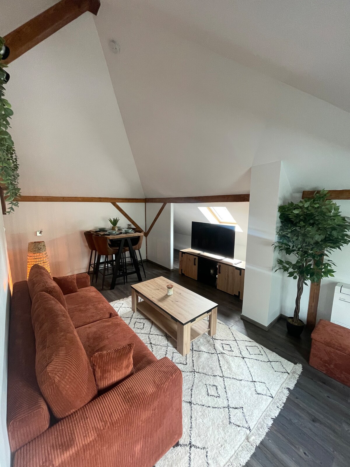 Appartement lumineux de 50 m² à 2 min des Thermes d’Amnéville, idéal pour curistes (cure 3 semaines) et séjours d’affaires longue durée. Conçu pour vous sentir chez vous : grande pièce de vie, cuisine équipée (plaques, micro-ondes, Nespresso, réfrigérateur), chambre cosy, salle de bain pratique, balcon agréable. Fibre Wi-Fi haut débit, TV et machine à laver. Parfait pour télétravail et déplacements professionnels. Lit bébé sur demande.