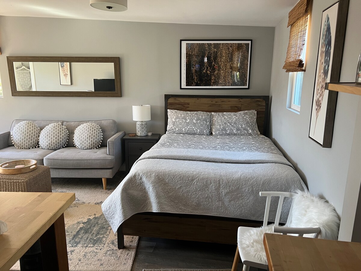 Odsjednite u modernom prostoru koji su odabrali umjetnici iz Oaklanda! Ovaj prostrani studio sadrži reciklirano drvo od štale s eklektičnim modernim namještajem. Udobno se smjestite u madrac Casper veličine 150-179 cm s luksuznom kvalitetnom posteljinom za spa. Radite na putovanju? Imamo gigabitni Wi-Fi. Parovi će uživati u vrtnoj masažnoj kadi i vanjskoj kadi s dvostrukim tušem. Samo se želite opustiti? Uskočite u našu privatnu vanjsku kadu za kupanje. Uključeni su i ograđeni parking koji nije na ulici, kao i besplatan dolazak u bilo koje vrijeme!