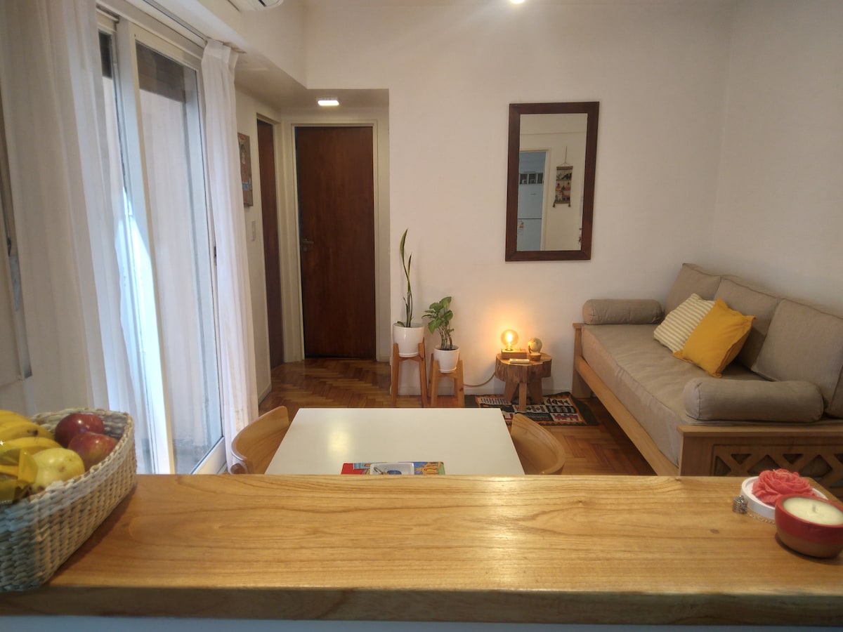 Svijetli i topli cijeli stan za tri osobe u Palermu, modernoj četvrti Porteño i u blizini svih prevoznih sredstava. To je moderan stan s bazenom, sumom i vešerom. Dvije sobe (45mts2) s balkonom. Spavaća soba ima bračni krevet i TV. Dnevna soba i trpezarija imaju krevet na razvlačenje, TV, sto i stolice. Kuhinja s električnom rernom i anafesom, mikrovalnom pećnicom, frižiderom, električnim odreskom i posuđem. Kupatilo s kadom. Uključuje posteljinu i peškire.