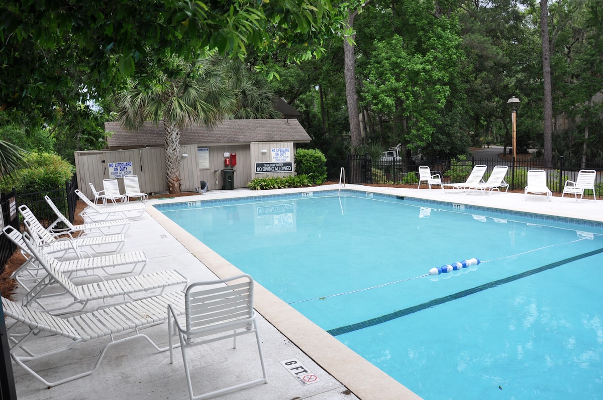 Opustite se i uživajte u Hilton Headu na South Forest Beachu, najpopularnijem dijelu otoka. Vozite se našim besplatnim biciklima za brzo putovanje do Coligny Plaze gdje se nalaze neobične lokalne prodavnice i restorani. Plaža je udaljena 2 ili manje minuta hoda, a bazen je niz hodnik. Naš kondominij je mali, ali savršen za odmor para ili nezaboravno putovanje s djecom. Imamo sve što vam je potrebno kako biste se osjećali kao kod kuće s velikim kuhinjskim aparatima i mašinom za pranje/sušenje veša u neposrednoj blizini.