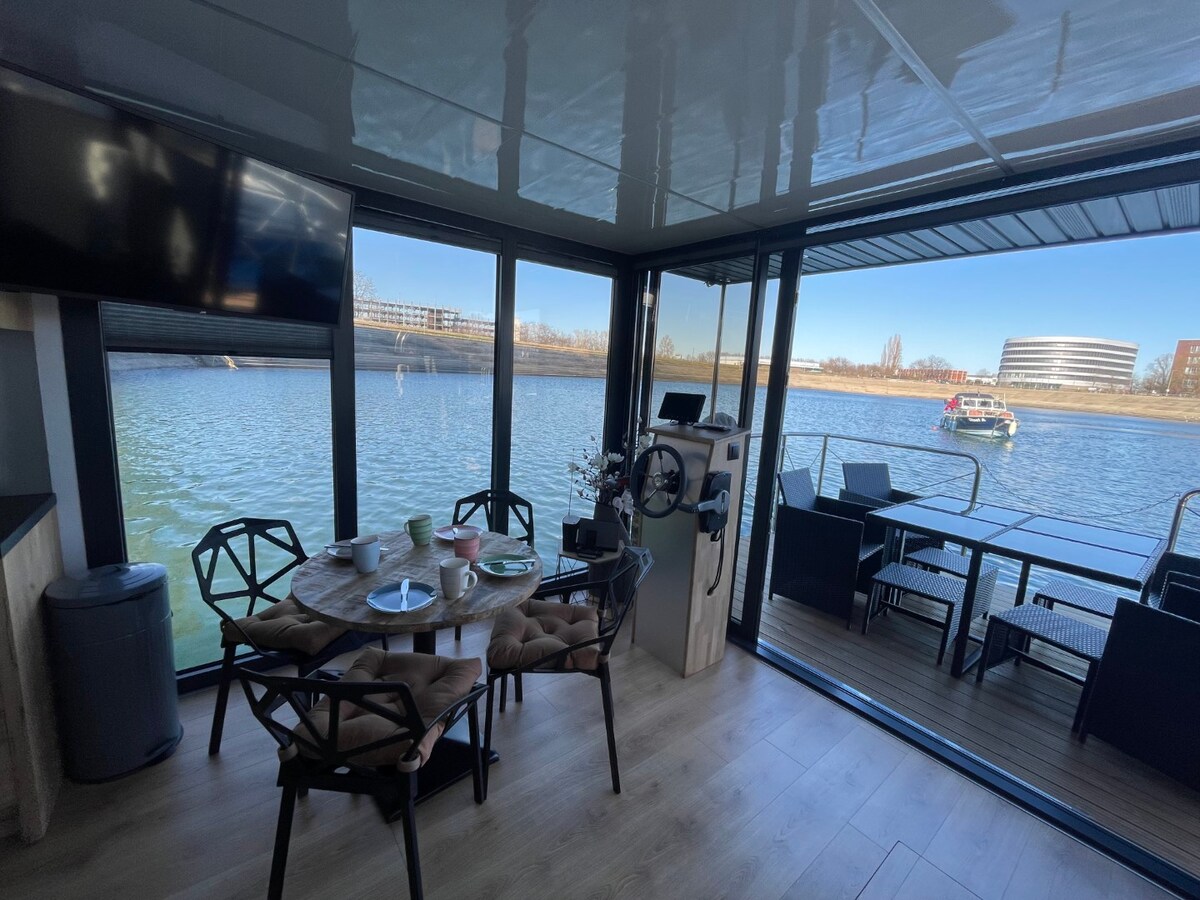 Our small 13 meter long houseboat Lore is located in the inner harbor of Duisburg, 3 minutes from the city center in one of the trendiest areas of the city: the inner harbour. The Lore has two spacious bedrooms, a roof terrace with lounge furniture, a small covered terrace, a living room with a direct view of the water, a kitchen and of course a bathroom with shower and toilet. The Lore is winter festival and can be booked 365 days a year. We have had three boats in the harbor since 2025.