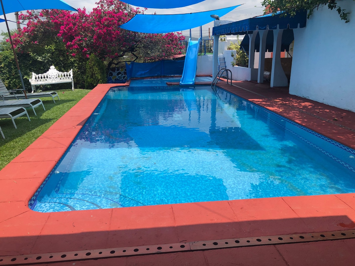 Feel like being home! This nice property on Morelos Mexican State,is near by a lot of Magic Towns and it has and espectacular Mountains view .It has 3 rooms, 2 with full beds and 1 with Queen and 2 restrooms. In the main room you have Air conditioner at anytime and a terrace. Enjoy the nice weather all the year and have fun at the pool! You’ll have all necessary to rest and feel the great energy we have al the place.