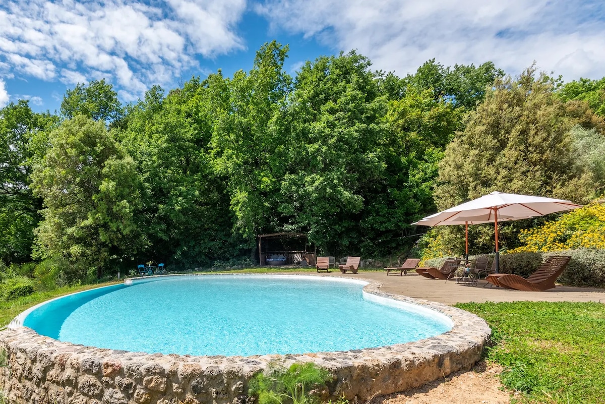 Moderno obnovljena kuća na otvorenom ima veliki vrt s voćnjakom i vinogradarsku pergolu s roštiljem i spektakularnim pogledom na dolinu. Smješten u selu u općini Chiusdino u blizini opatije San Galgano.
